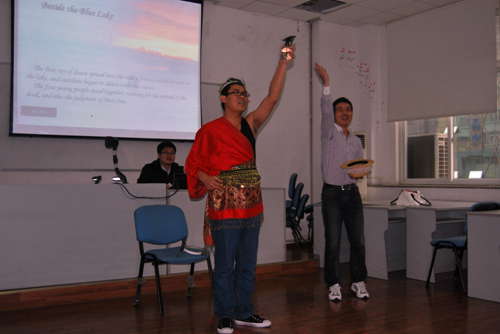 10月31日上午,成都教育基地210教室气氛热烈,第34期博士班同学们正在完成他们的写作课作业---演出一部自编自导自演的英语话剧《长发公主》,从剧本的编写,语法和语句的结构推敲到整个场景的布局,背景音乐的设定,道具的制作准备及演员如何更好的去诠释角色,可以看出演出的同学准备是多么充分、表演是多么认真和投入,观看的同学和老师兴奋地参与其中。