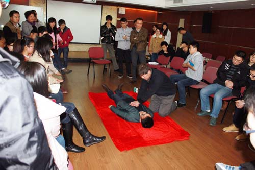 马建根据研究生身边较常见和易发的危险情况以及经常野外出差等特点,主要从五个方面做了介绍,如:到高原出差如何应对高山反应;野外出差过程中遇到扭伤或高处坠落受伤如何处理;在生活中一些常见伤害,如烫伤、切伤或溺水等如何处理;在外遇到有人倒地时如何救护;受到暴力伤害时如何处置等。同时,现场为研究生演示了不同部位绷带的包扎技巧及心肺复苏,人工呼吸等常见急救护理的操作方法。马建老师的讲解,语言幽默诙谐,配合丰富的医学案例及深入浅出的医学原理,赢得了在场研究生的一致好评。
