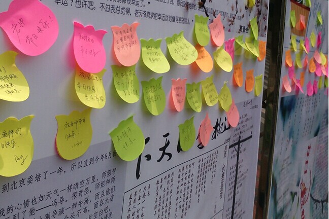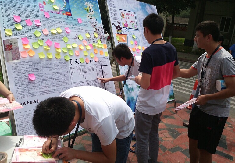 本次活动由“学生作品展”和“现场写祝福谢恩师”两部分组成。中午11时,活动正式开始。“学生作品展”以展板的形式展出了同学们的“感恩教师节”作品。这些作品体裁多样,感情充沛,有抒情散文、唯美诗歌等等,配以温情图片,浓浓师恩情跃然纸上。伴随悠扬的活动背景音乐,不断有师生员工驻足阅读展板。随后,“现场写祝福谢恩师”环节开始,越来越多的人加入到活动当中,在展板上贴出自己对老师的节日祝福,现场氛围达到了最高潮。