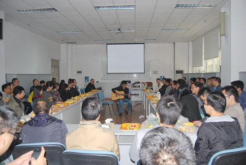 11月6日,为增强“第36期博士班”各所同学之间的友谊,加深了解,也给同学们提供展示自我才艺的舞台,成都教育基地组织博士班近100名同学及部分任课老师举办了一场主题为 “自娱自乐,和谐一家亲”的联欢活动,教育基地办公室主任熊鸣及教育基地部分老师参加了联欢活动。 联欢会由各所学生班委成员联合主持,在自我介绍环节,同学们都很热情地把自己的专业和家乡介绍给大家,穿插其中的是各所同学的才艺展示,有吉他弹唱、陶笛吹奏、唱歌等精彩节目,同学们还邀请了外教STEPHEN先生和大家一起玩抢凳子游戏,联欢会在德语老师李炳奎教大家跳交谊舞中愉快地结束。