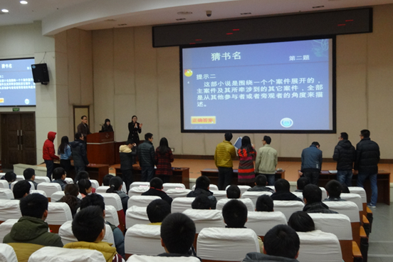 本次活动分为三个环节,每个环节设置淘汰机制。报名的同学三人分为一组,共组成了24组队伍参与到比赛中。第一关三国争雄环节中,参赛者对“悦读会”精华书籍的书名、经典电影名、歌曲名等进行竞猜,每轮4个小组同时进行竞答,经过一番智力大比拼6只队伍进入了第二关“步步为营”。观众们也积极踊跃回答选手们遇到的难题,现场气氛热烈活跃。