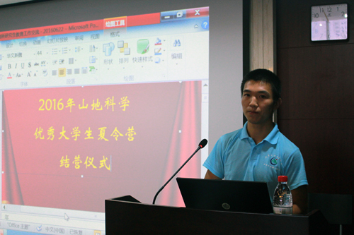 闭营仪式上,营员代表周书同学作了结营感言。他表达了夏令营让营员们对成都山地所的学术贡献和主要研究方向有了更多的了解,了解了自己所学专业与希望报考专业之间的联系与契合度,通过深入到科研单元参加各项实践活动,他们深切感受到山地所学术自由和科学自由的气氛,感受到了成都山地所的人情味,同时也被山地人的精神和社会责任感所感染和影响,这无疑是学习生涯中最接近科学、真理和科学家的一次活动。