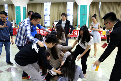 本次活动最后一个游戏也是整个活动的“点睛之笔”—川大玻璃杯互动环节。现场的所有男生或女生可以去主持人那里领取玻璃杯并将玻璃杯送给自己心仪的小哥哥或小姐姐,大胆寻找自己的缘分。当主持人宣布活动开始之后,现场帅哥美女都纷纷动起来了,主动去寻找自己的真爱。现场气氛好不热闹,有感人肺腑的真诚表白,有娇羞尴尬的低头答应,有撩人心弦的苦苦等待,更有“非卿不娶,非卿不嫁”的一见钟情!
