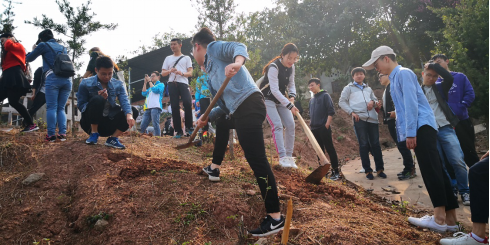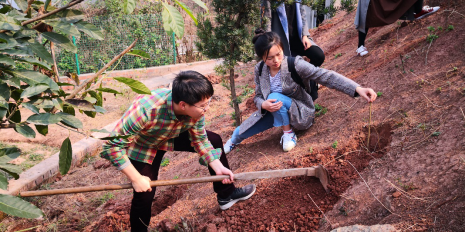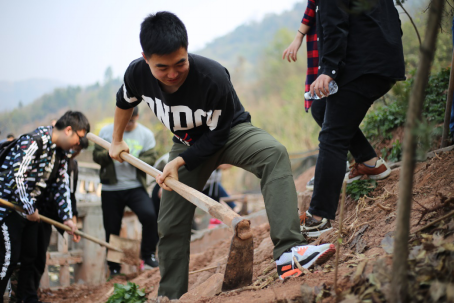 大家随即紧张、忙碌、有序地开始了今天的重头戏——义务植树。一双双敲惯了代码、摸惯了仪器的双手,从开始的生疏到渐渐熟练;一帮帮平时不太熟悉、交集少的同学,从开始的拘谨到渐渐熟络。不久,自山坡顶至山坡下,皆是一棵棵沐浴在春日暖阳下的幼小树苗。回头望去,那跳跃在眼前的一抹抹绿色,是大自然蓬勃的生命力,仿佛在告诉我们一个词——希望;转过身来,光电学子们不惧艳阳高照,汗水不断流淌,锄头铁锹飞舞,这是专属于悻悻学子的生命力,给这片山水传递着一个词——青春。