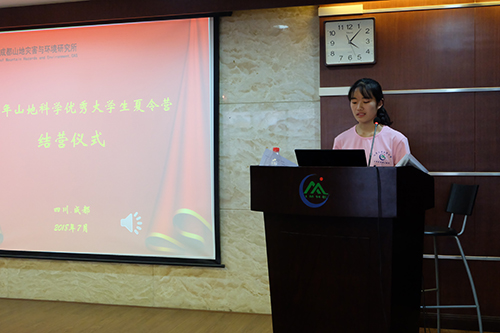 仪式上,来自山地灾害组的孙毅同学、山地环境组的耿婉露同学、数字山地组的候姗姗同学、山区发展组的江南同学分别代表各小组发表了结营感言,表达了夏令营期间的所得所感。通过夏令营活动,让营员们近距离接触了导师和在读研究生,也对山地科学研究有了更多的认知,对成都山地所的学术贡献和主要研究方向有了深入了解。通过深入到科研单元参加各项实践活动,使他们深切感受到了成都山地所浓郁的学术氛围和强烈的社会责任感、使命感。大家表示,这是在学习生涯中感觉最接近科学真理和科学家的一次活动。