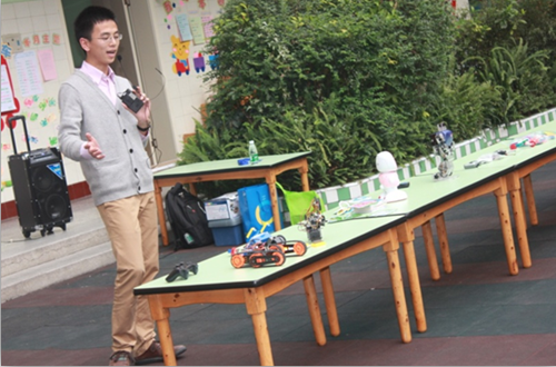 来自中科院深圳先进技术研究所的杨叔叔,现场为大家演示了机器人是如何讲故事、爬楼梯和跳舞的。其中,跳舞机器人最能干,会跳好多的舞蹈,动作优美节奏感强,一首《江南 style》的舞蹈把孩子们带动起来与机器人共舞。