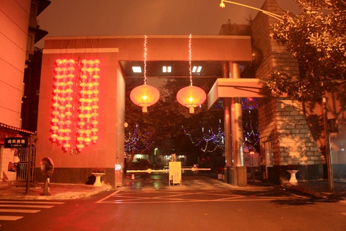 成科后勤公司在园区南北大门及行道树两旁装上灯笼和彩灯,迎接