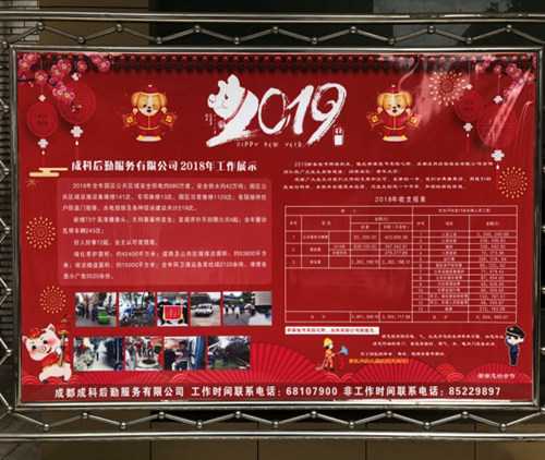 近日,成科后勤公司在园内单元宣传栏展示了2018年主要工作,并在后勤服务大厅门口对公司年度收支情况进行了公示,让园区广大业主全面了解园区公共服务工作。春节将至,后勤公司张灯结彩,为园区营造了温馨的节日气氛。