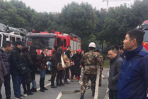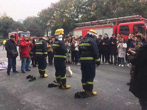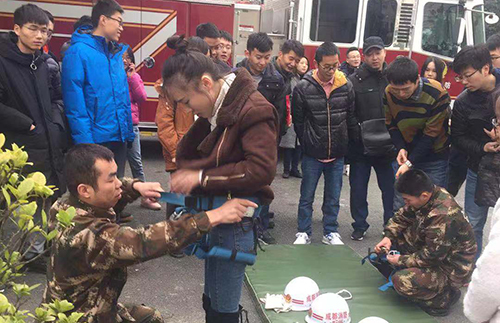 此次演练活动由消防官兵作现场指导,并在演练开始前带领大家参观了各种消防专业设备,并为大家讲解了消防安全知识和灭火器的正确使用方法,演示了快速集结、快速着消防服、快速连接消防水袋、高空速降等火灾救援专业技能。