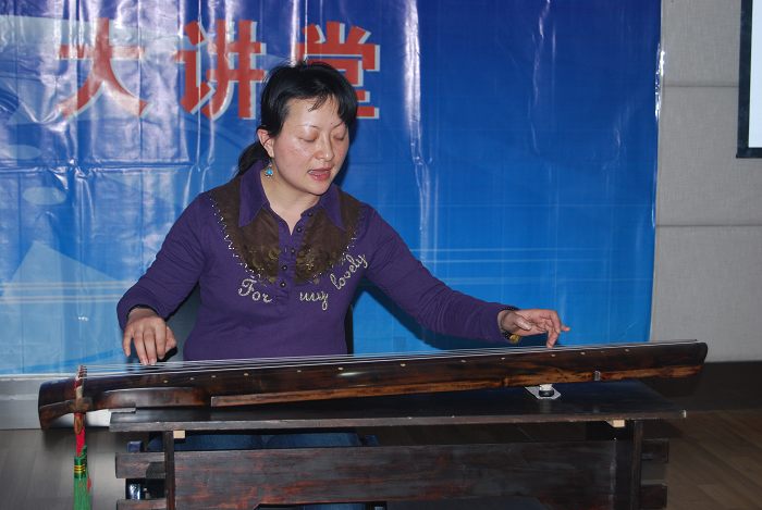 “琴、棋、书、画”历来被视为文人雅士修身养性的必由之径,古琴因其清、和、淡、雅的音乐品格寄寓了文人凌风傲骨、超凡脱俗的处世心态。戴茹女士现场抚琴,弹奏了《醉渔晚归》、《酒狂》等脍炙人口的佳作。随着她指尖的流动,老师和同学们在古朴的琴音中感悟了中国博大精深的悠久文化历史的传承,体会古琴艺术这一非物质遗产的动人魅力。古琴写意、写真的悠然旋律引起了在场师生的共鸣,在《沧海一声笑》激荡起伏琴音的伴随下古琴赏析活动圆满结束,同时也留给了师生们思索未来、感悟人生的启迪。