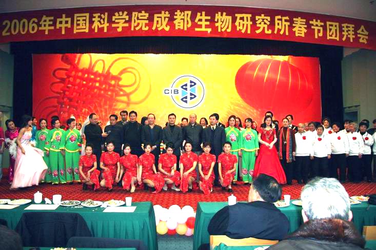 在团拜活动主会场——镜湖园宾馆大会议厅,到处张灯结彩,座无虚席,人人喜气氛洋洋。团拜活动在主持人“普天同庆,一声爆竹辞旧岁”、“大地共欢,万条绿绦迎新年”的喜庆声中开始。成都生物所常务副所长吴宁代表所党委、所务委员会向全所职工和学生拜年,祝大家新年快乐,阖家幸福!他说:在过去的一年中,成都生物所在全所职工的共同努力下,在学科建设、科学研究、成果转化、人才队伍建设、现代化管理和科研平台建设等方面取得了较大进展,提高了科技创新能力,为服务国家需求,推动地方经济社会发展,促进科技成果转化做出了重要贡献,成为四川省科技创新的重要骨干力量,被中共四川省委、四川省人民政府评为“2005年四川省科技创新先进单位”。希望全所职工再接再厉,在三期创新中作出更大成绩,为成都生物所的发展作出贡献。随后,所领导班子向2005年度在科技创新中取得好成绩的研究团队颁发了奖牌;为年满80周岁、70周岁的离退休老同志祝寿,祝他们幸福安康;向获得“奔驰”奖、“磐石”奖的职工颁发了证书,感谢他们为研究所的发展作出的辛勤奉献。