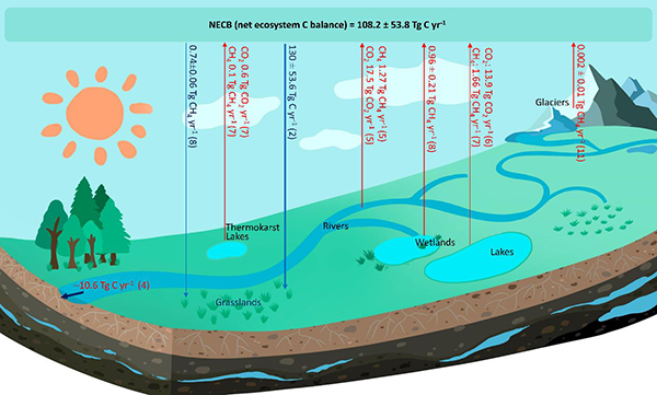 研究发现,高寒草地是重要的CO2和CH4汇,而水体向外界水平输送的碳是主要潜在流失路径。河流通过水平运移和垂向释放(CO2和CH4)共抵消了陆地CO2汇的12.6%,高寒湿地、湖泊、热融湖塘、冰川等通过碳损失抵消了陆地碳汇的4.2%。综上,青藏高原陆表水体路径的碳流失仅抵消高寒生态系统CO2汇的16.8%,陆地生态系统CO2汇仍主导区域净碳平衡。