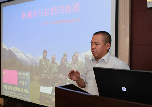 大会特邀了汪阳春高级工程师介绍其代表成都山地所参加尼泊尔、西藏地震灾区抗震救灾的先进事迹。地震发生后,山地所应武警警种学院邀请,指派汪阳春高工配合武警部队参加了灾区交通要道抢通保通工作,期间,他克服余震不断、气候恶劣、条件艰苦等困难,历时20余天,利用无人机航拍技术和多次参加抗震救援的经验,翻越海拔5000米以上的喜马拉雅山,完成西藏、尼泊尔区域飞行5000多公里,获得了大量受灾公路沿线灾情的立体影像和数据,为中尼公路抢通保通提供了关键的航拍基础数据,配合武警警种学院园满地完成了中央和武警总部下达的救灾任务,受到了武警部队的表彰,也为成都山地所争得了荣誉。