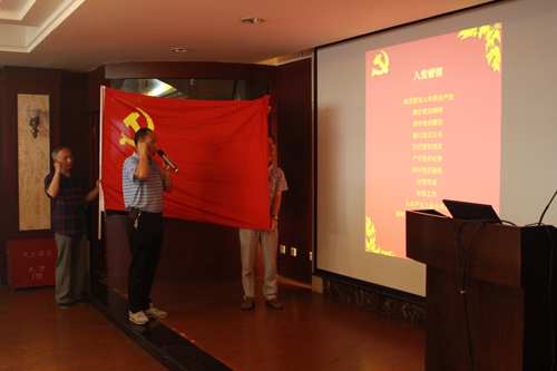 在雄壮的国际歌声中,庆祝大会隆重开始,白发苍苍的老党员们,精神矍铄,大家全体起立,面对着鲜红的党旗,高举右手,在党支部书记曾跃宗同志带领下重温入党誓词。