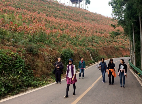 玉皇养生谷森林公园中连绵起伏的山丘用木制栈道相连。大家沐浴着明媚的阳光,结伴沿着栈道登山行走。登上山顶,大家望着远处的美景,心旷神怡。山路的一边种着高大挺拔的树木,另一边的山坡上有着成片的玉皇红杨,一条山路,两种不同的风景感受。现在正是菊花开放的季节,漫山弥漫着菊花的香气,让人流连忘返。登山过程中大家相互沟通、相互鼓励,营造了一个团结、互助、积极向上的活动氛围。