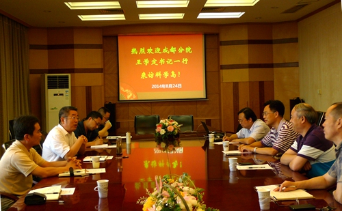 8月24-25日,成都分院党组书记、常务副院长王学定、副院长王嘉图赴合肥,通过与合肥物质科学研究院(以下简称合肥研究院)、安徽省经信委、安徽省科技厅座谈,深入了解创新政策及企业创新体系建设。合肥研究院院长匡光力,副院长江海河,安徽省经信委副主任吴韦人,安徽省科技厅党组成员、省创新办副主任夏辑参加座谈。