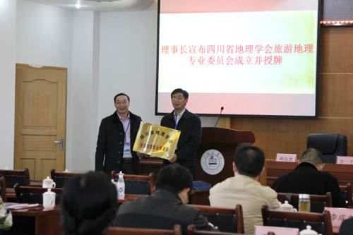 四川省地理学会理事长韦方强研究员宣布了新秘书长及理事单位等事宜,并宣布四川省地理学会旅游地理专业委员会成立,随后进行了授牌仪式。