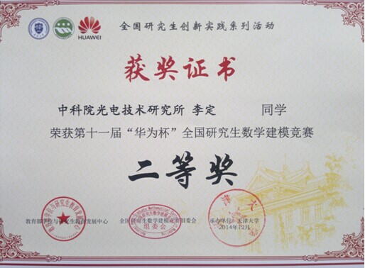 本次竞赛于9月19日至9月23日期间进行,光电所研究生会组织研究生报名参加比赛,在本次竞赛中光电所共有4支参赛队伍。经过活动承办单位天津大学研究生院的组织评审,最终的获奖名单于11月17日公布,光电所由孔林、申立军和李定同学组成的参赛队伍获得了全国二等奖。